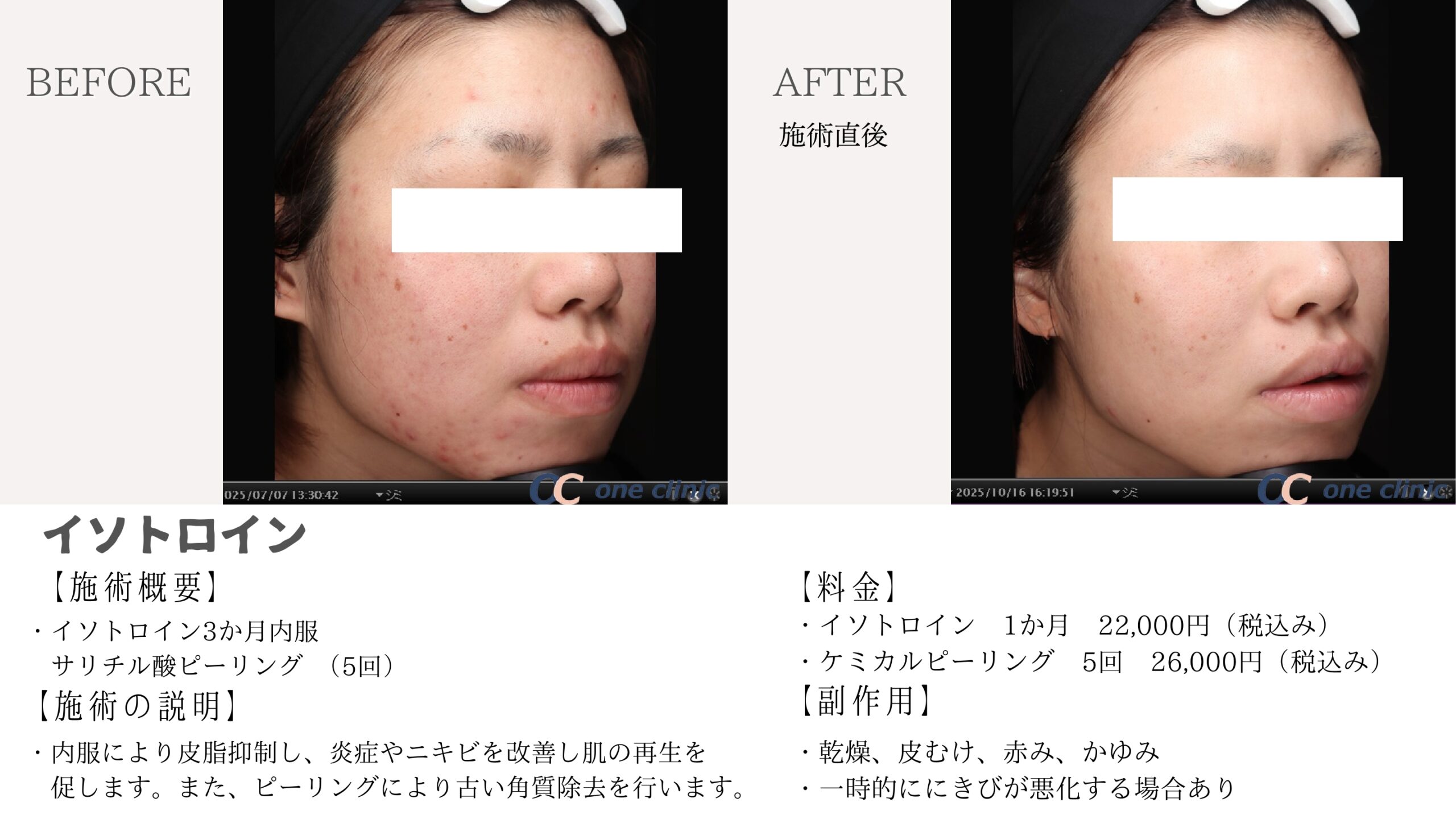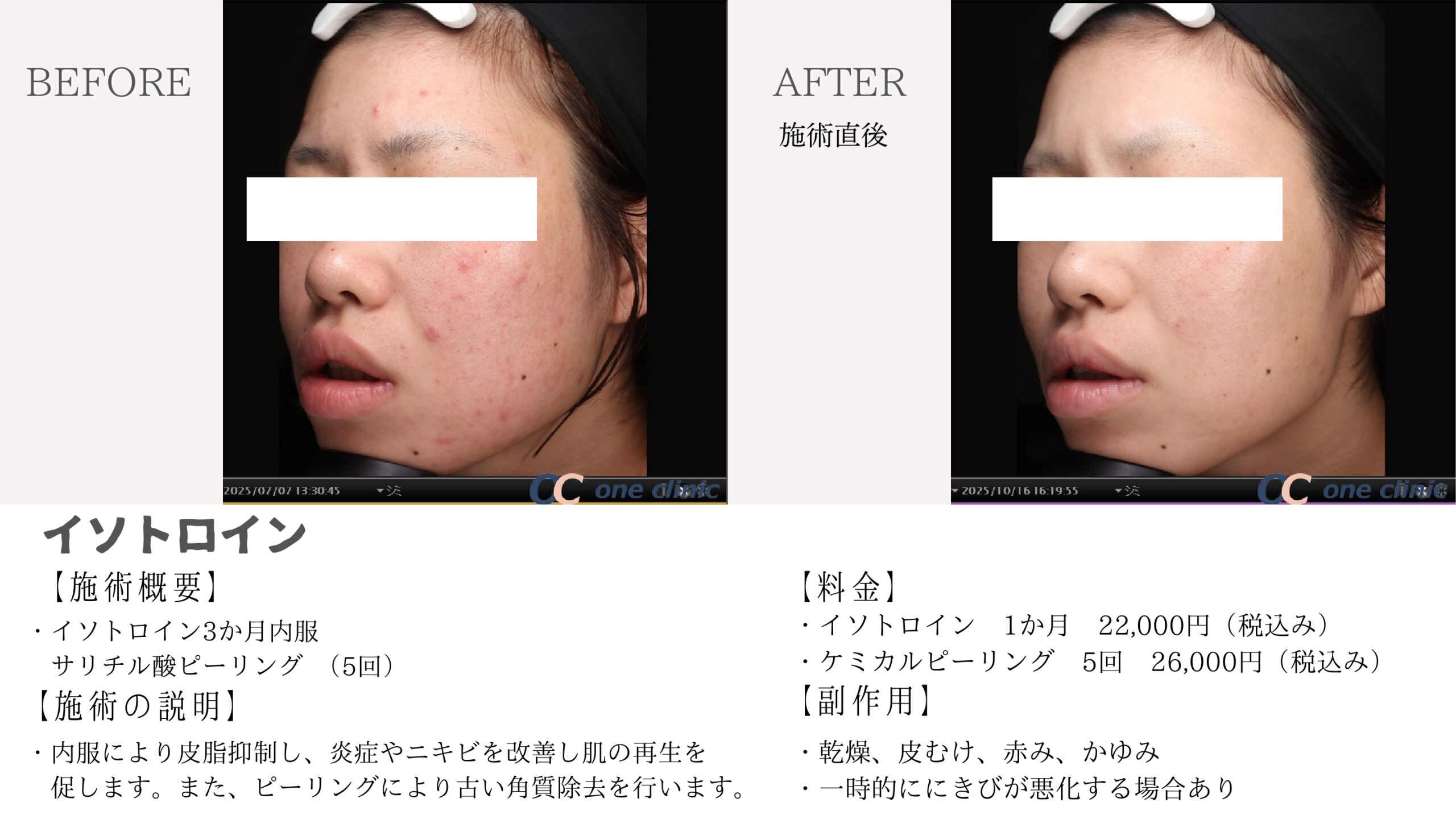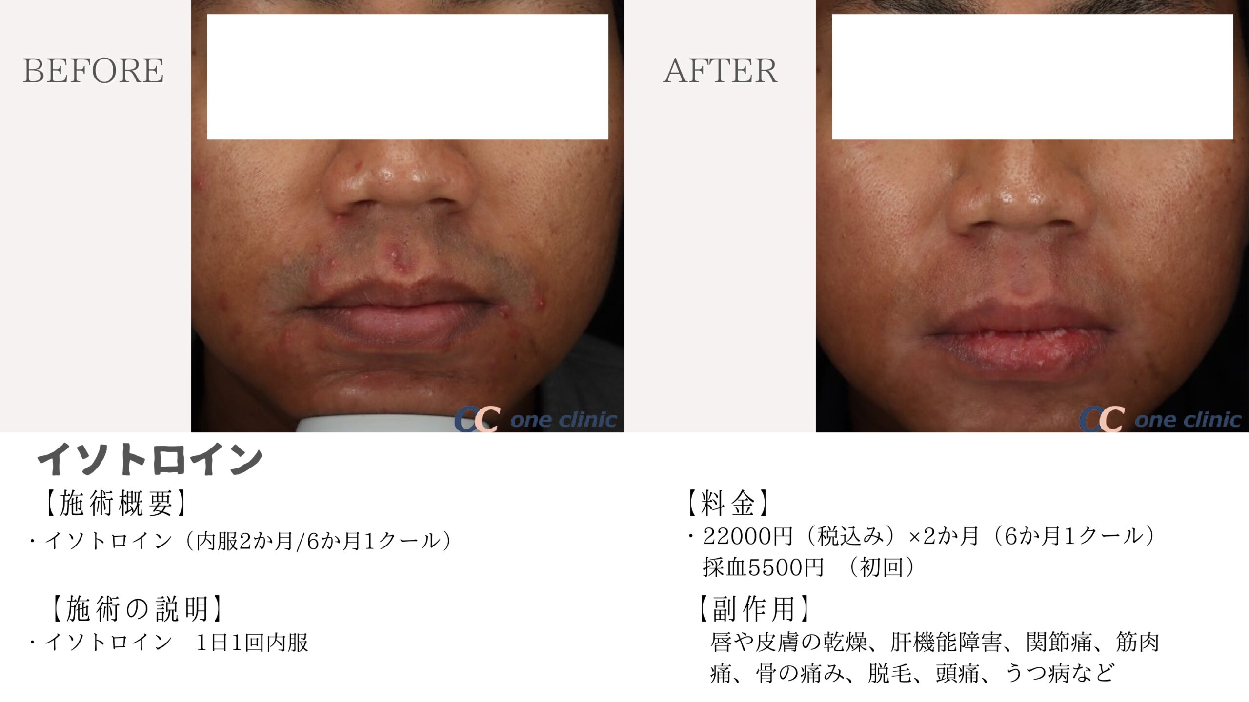 日本では厚生労働省の認可が得られておらず、保険の適用外となっています。この薬は副作用があるため、患者様に対して詳細な説明が必要です。ですが、医師の指示に従い、正確な用法用量で使用すれば、これまで改善しづらかった重症のニキビに対して効果を期待できます。