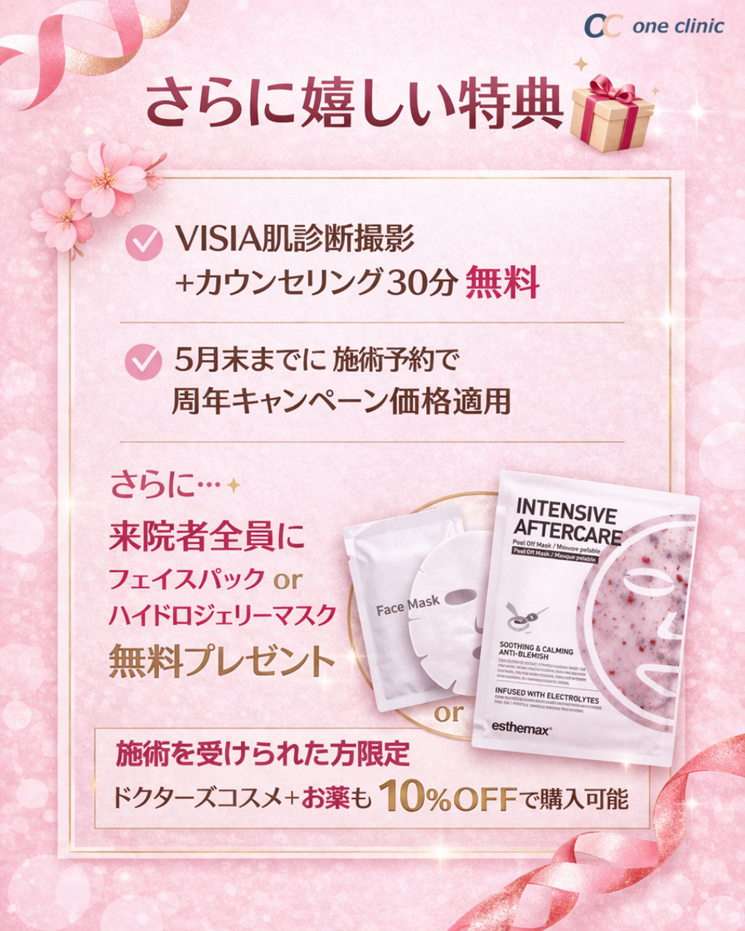 今回のイベントでは、全施術10%OFFをはじめ、通常3,300円のVISIA撮影+カウンセリング30分無料、さらに来院者全員へのプレゼント🎁など、特別な内容をご用意しております♬