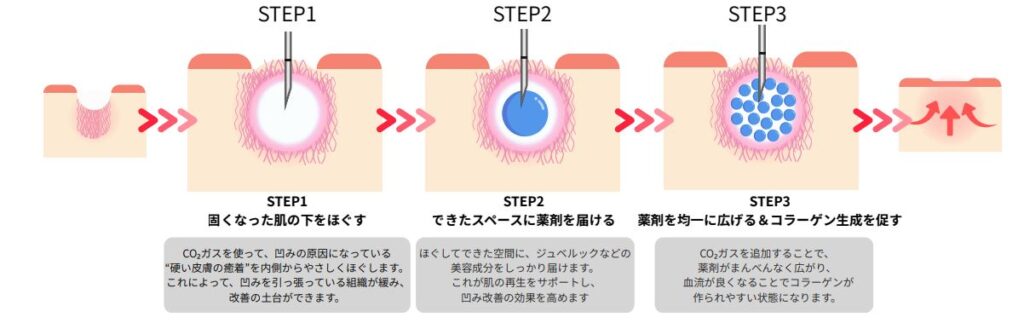 ニキビ跡の凹みの原因である皮膚の内側の固まり(癒着)をほぐして、再生成分をしっかり届け、広げてコラーゲンを増やす ——